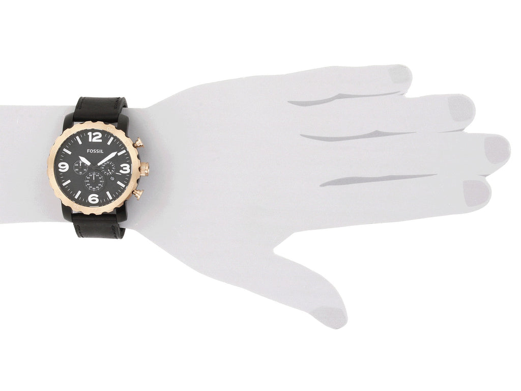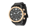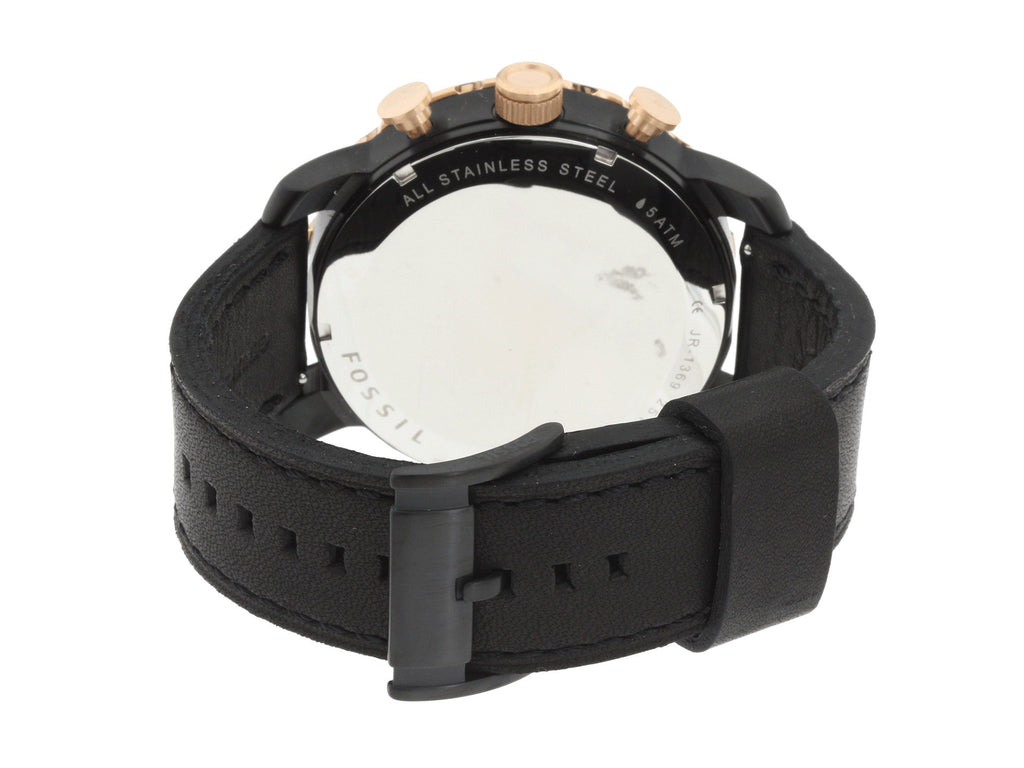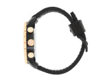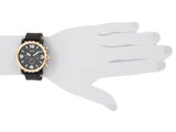 Three-hand analog display with quartz movement, three sub-dials and date display window.
