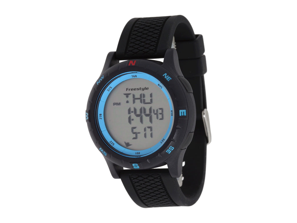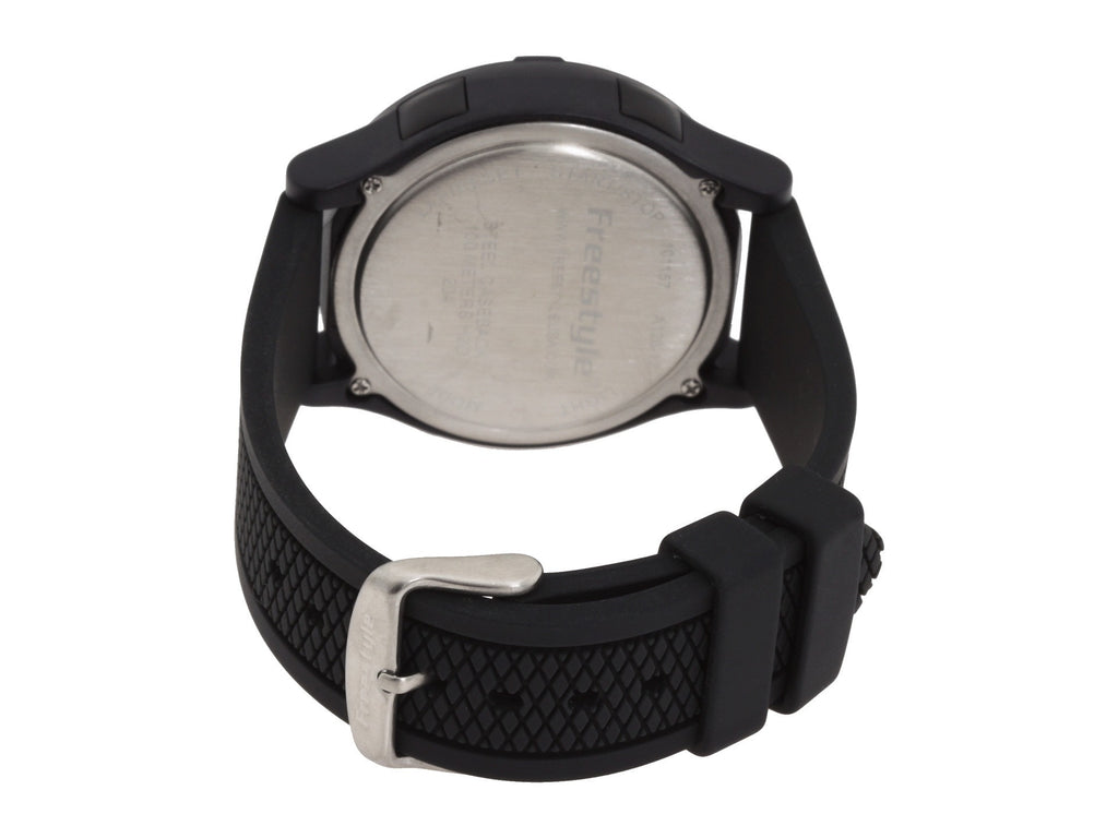 Calling all die-hard Freestylers! The rad watch you grew up with is back and even gnarlier than you remember! Digital and analog display. Steel case. Turning top ring. Stopwatch function. Two alarms. Date display. Durable polyurethane strap with buckle closure.